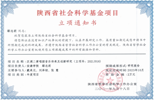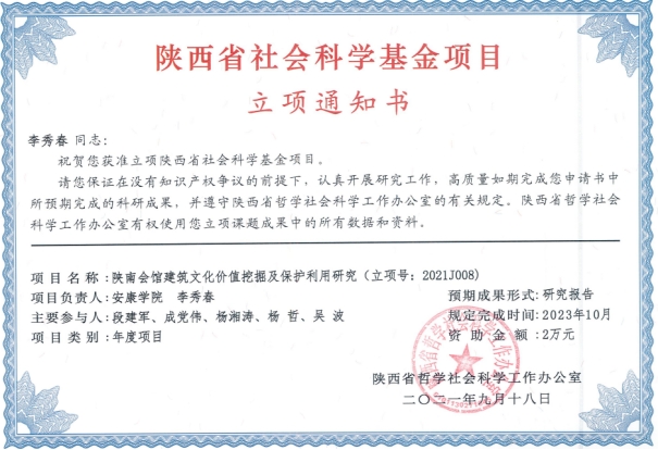 近日,陕西省哲学社会科学工作办公室公布了2021年度陕西省社科基金年度项目立项结果,澳门信誉青年教师鄢志莉、李秀春申报的项目获批立项。