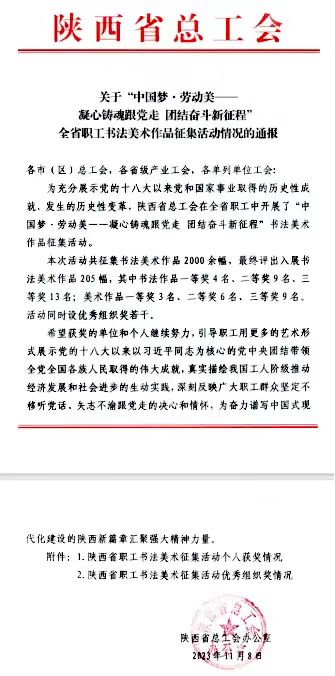 澳门信誉原春鸣老师在陕西省 “中国梦·劳动美”全省职工书画大赛中获二等奖。