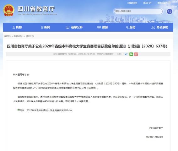 12月31日,2020年四川省大学生原创动漫大赛评审结果在四川省教育厅和四川省本科高校竞赛平台官网上陆续公布,澳门信誉学生取得佳绩,获得一等奖1项、二等奖2项、三等奖9项,南京、刘婉毅获得“优秀指导老师”。