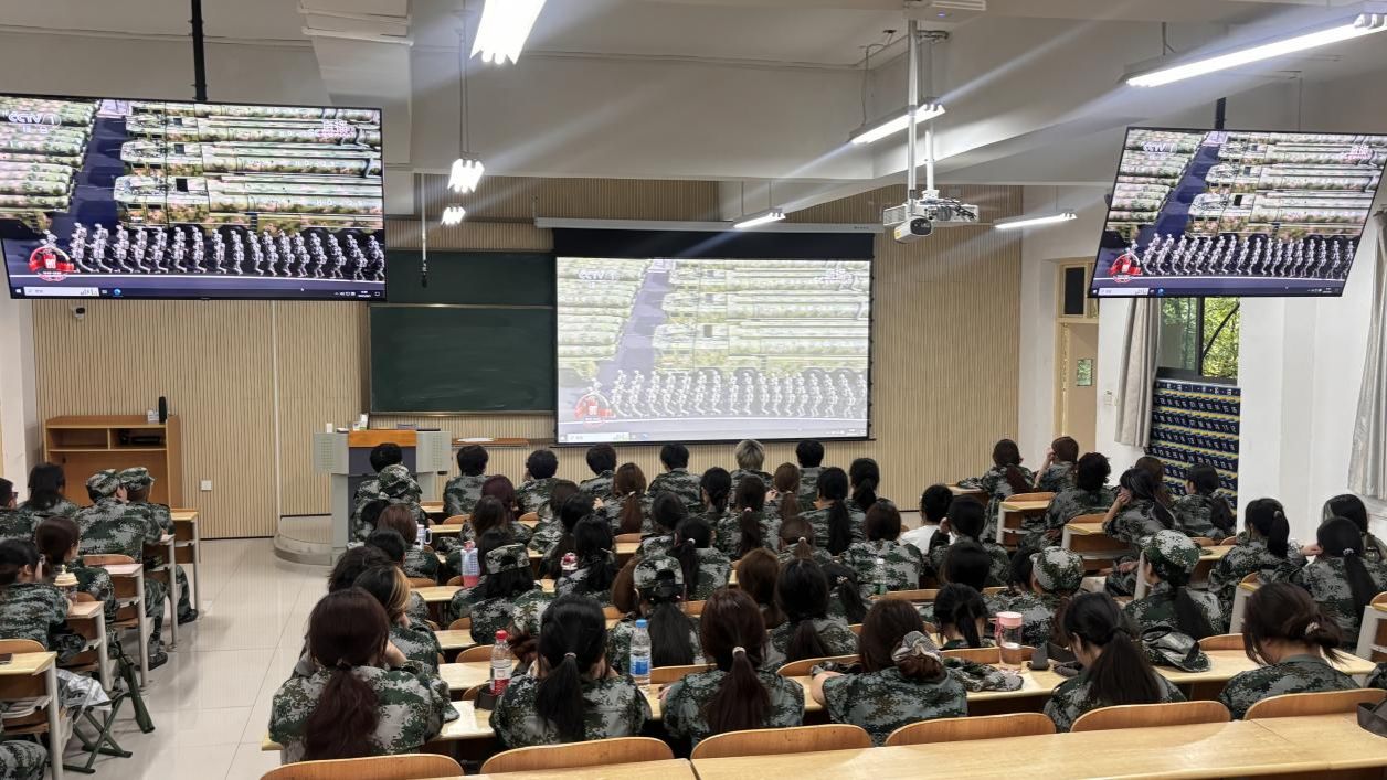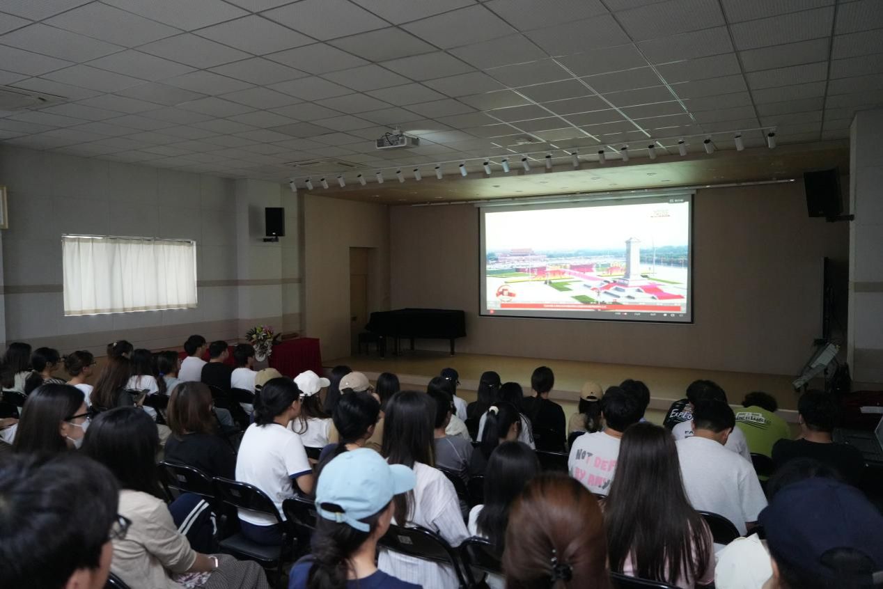 上午9时,活动在庄严的国歌声中拉开序幕。党总支书记张慧强调:九三阅兵是铭记历史、弘扬爱国主义精神的重要契机,全体教职工需将爱国情怀融入艺术教育实践。随后,全体人员集中观看九三阅兵直播,感受国防力量的磅礴气势。直播中,受阅官兵整齐划一的步伐、先进精良的国防装备,引发强烈共鸣,现场多次响起热烈掌声,激发了在场师生的强烈民族自豪感。