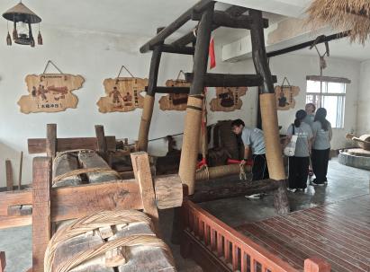 团队抵达中坝作坊小镇后,在工作人员的带领下,先后参观了榨油坊、草鞋坊、陶艺坊、染坊等传统手工作坊。这些作坊保留着古老的生产器具和传统工艺流程,队员们近距离观察了匠人如何运用祖辈流传的技艺进行生产,从原料的选取到每一道工序的精细操作,让大家感受到了传统手工艺的独特魅力,使队员们对中坝作坊小镇作为“活态非遗博物馆”的文化价值有了初步认识。
