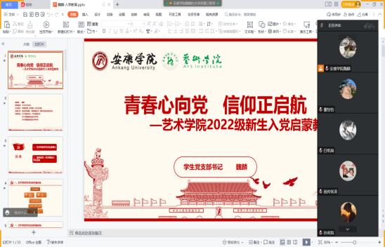 入党启蒙教育是加强大学生思想政治教育,筑牢理想信念根基的基础性工作,是培养大学生政治信仰的第一课。为进一步引导2022级新生树立坚定的理想信念,厚植家国情怀,锤炼品德修为,强化责任担当,端正入党动机。9月27日,澳门信誉最好十大平台利用腾讯会议召开“青春心向党 信仰正启航”2022级新生入党启蒙教育专题讲座。本次讲座由学生党支部书记魏麟主讲。