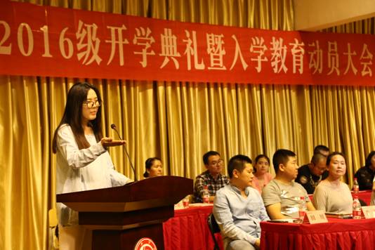 2016级新生代表,冯亚文同学代表全体2016级新生发言。他谈到从到学校的第一天至军训生活,逐一感受到院领导对同学们的关爱,表示将和全体新生尽快适应大学生活,用丰富多彩的大学生活充实自己、锻炼自己、提高自己。