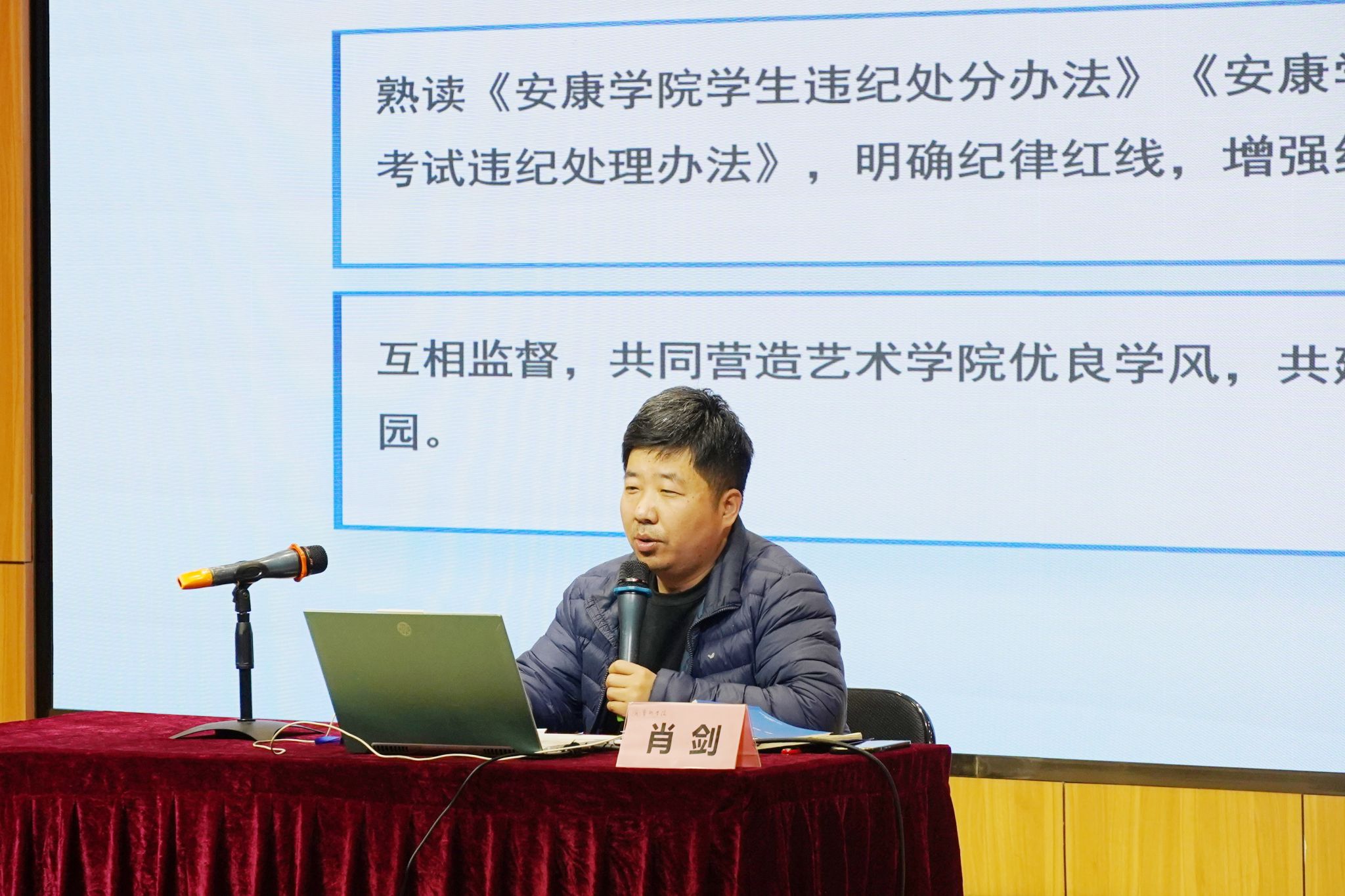 肖剑结合澳门信誉最好十大平台学生特点重点带领同学们对《澳门十大信誉网赌大全学生管理规定》、《澳门十大信誉网赌大全学生违纪处分办法》、《澳门十大信誉网赌大全学生考试违纪处理办法》等学校管理规定进行学习,并针对《学生手册》中的重要关注点,与同学们互动交流并为同学答疑解惑,帮助同学们深刻认识到遵守校规校纪的重要性,增强树立底线意识,明确行为准则。