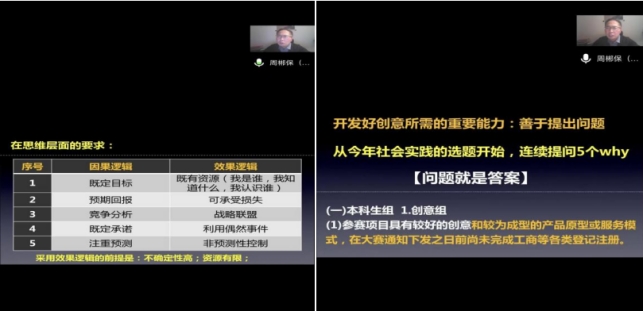 随后,周郴保副教授做了主题为《梦在前方·路在脚下——双创竞赛参与及获奖专题分享》专题报告。他从国家战略需求和高等教育发展方向出发,结合学生就业能力提升,人才培养模式改革、学科发展需求等多个方面解读了“互联网+”大赛在高等教育教学改革中的重要意义,并对第八届大赛的总体安排、赛道组别设置、赛程赛制、参赛要求等关键信息进行了深度解读。此外,他还从项目、团队、老师三个维度对参赛过程中指导教师职责、学生团队构成、资源配置、项目培训打磨机制等给出了针对性意见。