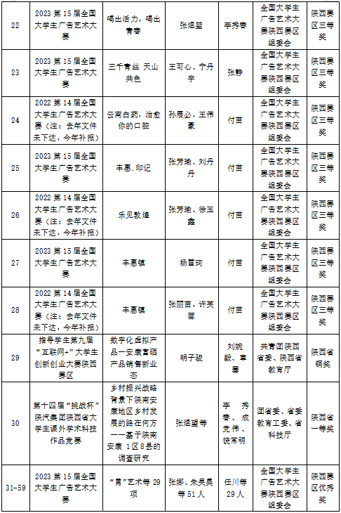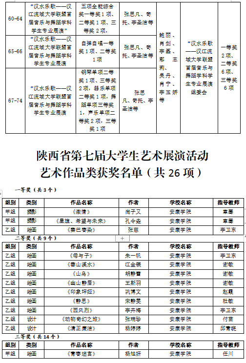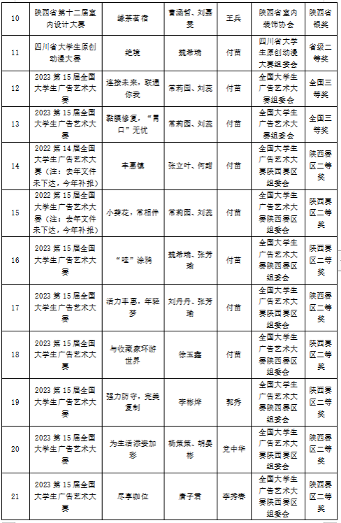 2023年,澳门信誉最好十大平台学子在16届中国大学生计算机设计大赛、第15届全国大学生广告艺术大赛、第十四届“挑战杯”陕汽集团陕西省大学生课外学术科技作品竞赛、第九届“互联网+”大学生创新创业大赛、“汉水乐歌——汉江流域大学联盟首届音乐与舞蹈学科学生专业展演”活动等各类比赛中获得省级以上比赛奖项110项,其中国家级二等奖2项、三等奖2项,省级一等奖7项、二等奖31、三等奖38项、优秀奖29项。以赛促学、以赛促教、以赛促改,有效的促进了艺术类应用型人才培养。