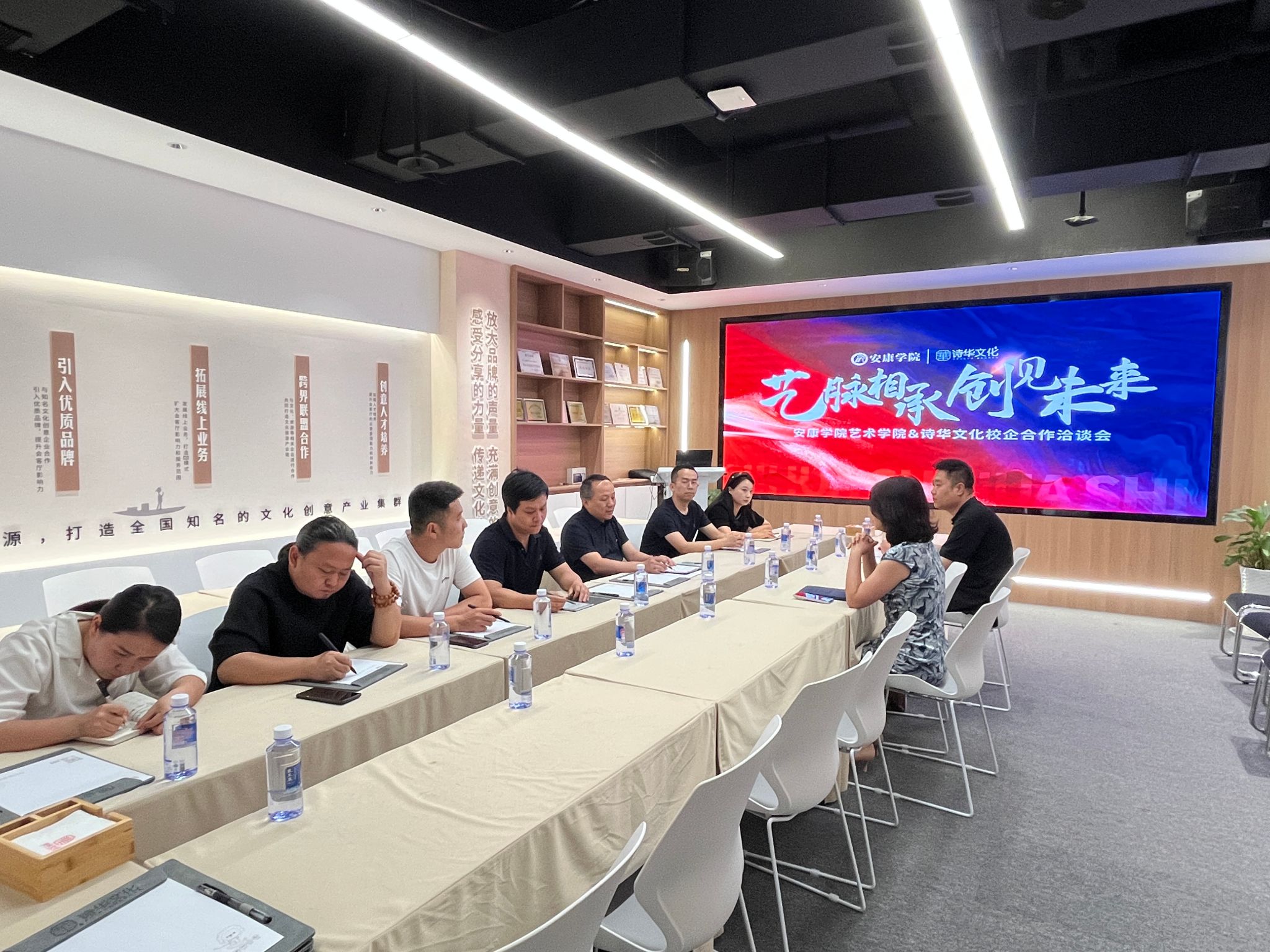 交流活动中,李景林院长介绍了学院在学科建设、人才培养及社会服务等方面的情况。诗华文化总经理陈友群介绍了“安康诗华文化城市文创会客厅”在文化传承、文化创意、文化空间、文化交流和文旅融合等领域发展,提出了企业人才需求,表达了与学院建立深度合作的意愿。双方在人才培养、实践基地建设、学生实习、就业等方面进行了深入的交流,并达成初步共识。