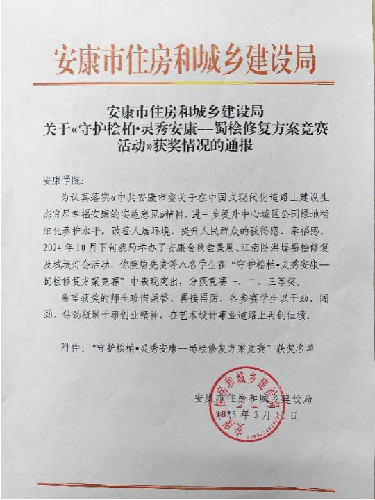 2025年3月12日,澳门信誉学生在安康市住房和城乡建设局市政园林处主办的安康中心城区江南防洪堤蜀桧抢救性修复工程方案设计竞赛中获得佳绩。