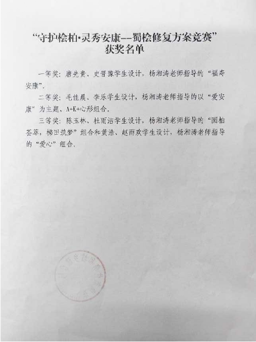根据现场基础景观现状,杨湘涛老师指导学生调研考察。通过查阅资料,制定出以安康地域文化为主线,与江南防洪堤周围景观相融合,依据植物生态特性对蜀桧进行图案优化造型设计方案。设计方案既有视觉美观的体验,又能提升江边景观的审美意蕴,增强了滨江景观的总体效果。在竞赛中学生作品荣获一等奖1项、二等奖1项、三等奖2项、优秀奖10项。目前部分获奖作品已用于蜀桧修复,获奖学生接受安康电视台采访并介绍获奖作品的设计理念。