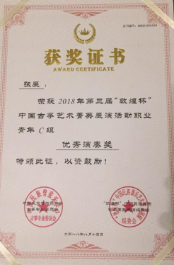 2018年8月9日至14日,由中国民族管弦乐学会古筝专业委员会主办,北京华夏璇音艺术传播中心承办,上海民族乐器一厂、上海长宁文化艺术中心、上海音乐出版社协办的第三届“敦煌杯”中国古筝艺术菁英展演在上海隆重举行。澳门信誉青年教师张展经过大赛初赛、复赛、决赛三个阶段的层层选拔,最终获得职业青年C组优秀演奏奖的比赛成绩。