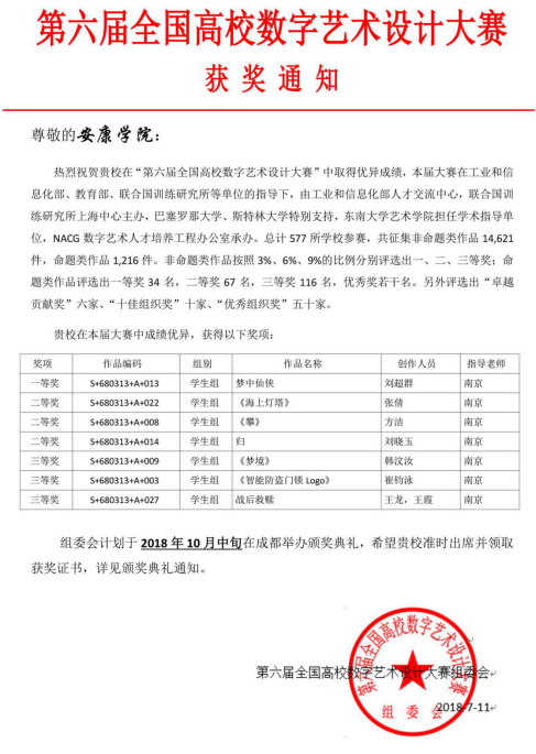 近日,2018年第六届全国高校数字艺术设计大赛比赛结果公布。澳门信誉学子首次参加该项赛事,与包括北京大学、中国美术学院、东南大学、北京师范大学、华中师范大学、西北大学等众多985、211名校在内的全国共计577所高校学生同场角逐,澳门信誉学子最终分别获得一等奖1项、二等奖3项、三等奖3项的喜人成绩。