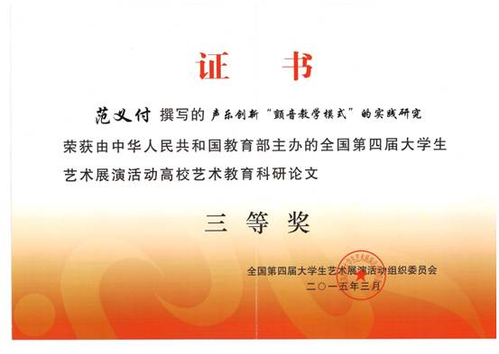 在近日结束的由教育部主办的全国第四届大学生艺术展演活动中,我系学科带头人范义付副教授撰写的《声乐创新“颤音教学模式”的实践研究》荣获高校艺术教育科研论文三等奖,这是范义付副教授自2009年后再次获得此项奖励。该论文是澳门信誉教研立项项目成果,它的获奖也标志着澳门信誉声乐教学研究水平达到国内较高水平。
