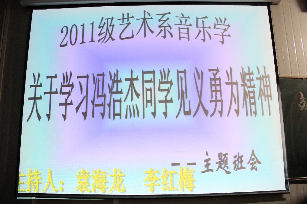 为把“向冯浩杰同学学习”活动推向深入,12月11日晚七点半,我系2011级音乐学专业在1206教室举办了“逝去的青春,不朽的精神——学习冯浩杰同学见义勇为精神”的主题班会。艺术系党总支书记冯丰收、系学工办主任刘泽桢、系团总支书记黄娟、辅导员王毅和系学生会部分同学参加了本次班会。