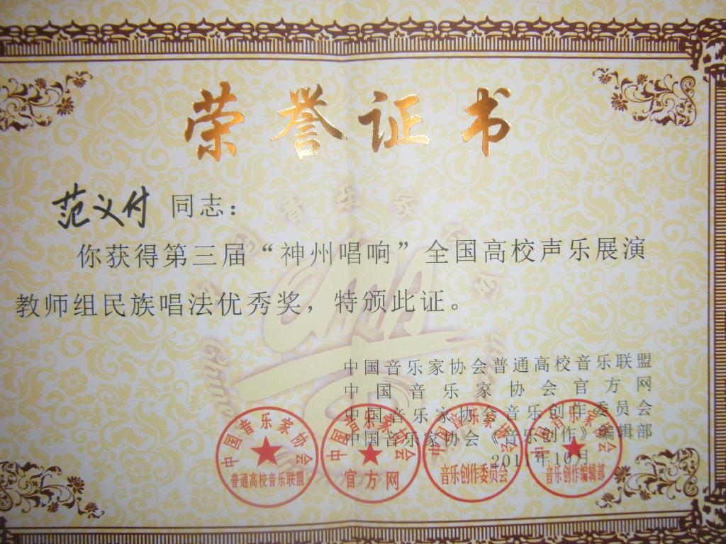 在刚刚结束的第三届“神州唱响”全国高校声乐展演比赛中,我系范义付老师获教师组民族唱法优秀奖。