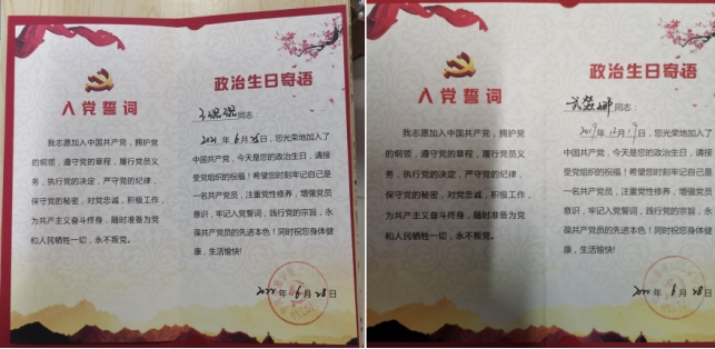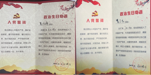 共过一次政治生日·分享一个入党故事。澳门信誉最好十大平台学生党支部为全体毕业生党员精心设计了党员政治生日纪念卡。毕业生党员代表曹丁太、惠洁婷分享了入党故事。通过共过政治生日、分享入党故事,使每名学生党员强化身份意识,坚定政治信仰,永葆政治本色。