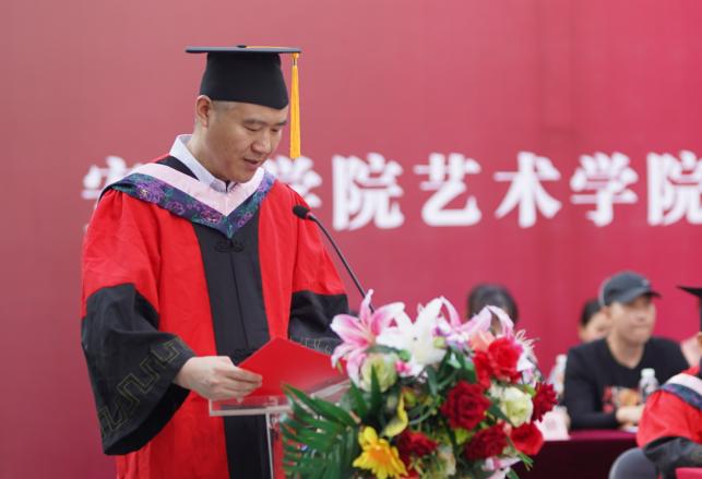 院长成党伟在致辞中代表学院向圆满完成学业的毕业生表示热烈祝贺, 他讲到:2022届毕业生欣逢盛世,与时代共享荣光,见证了国家追光逐梦的发展历程。他对毕业生提出四点希望:一是希望同学们驻足理想、逐梦而行。胸怀家国,让青春在正确的道路上挥洒汗水;二是希望同学们胸怀格局、包容勇毅。在接纳中放大格局,在磨砺中提升境界,用宽广的胸怀热情拥抱美好的未来;三是希望同学们心向阳光,砥砺前行。把握青春时光,在砥砺前行的道路上成为更为优秀的自己;四是希望同学们保有本真、芳华永继。要用理性的视角、感性的情感去审视生活之美、人性之善,胸怀家国情怀,遵守社会公德,严守做人底线。
