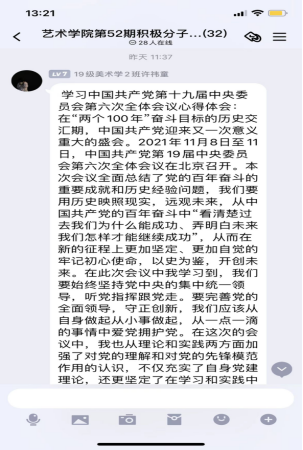 “中国共产党第十九届中央委员会第六次全体会议总结了党百年奋斗的重大成就和历史经验,作为新时代思想政治辅导员,我更应该承担起属于我的责任与使命,坚定理想信念,始终坚持中国共产党的坚强领导,以科学的理论武装自己的头脑,牢记全心全意为人民服务的宗旨,在工作和生活围绕学生、服务学生、关照学生。”