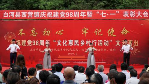 为认真学习贯彻习近平总书记关于扶贫工作的重要论述和“不忘初心、牢记使命”重要讲话精神,落实省委教育工委“双百工程”中“提质增效”的要求和学校党委对“双百工程”文化惠民的决策部署,澳门信誉最好十大平台党总支充分发挥学科专业优势和人才智力优势,通过“文化惠民乡村行”活动,以“三结合”的形式,将“双百工程”扶贫工作与加强基层党建工作、服务地方行动计划、实践教学和科学研究紧密结合起来,旨在将项目抓出质量,抓出实效,凸显出学校服务地方的能力与水平。适逢今年是中国共产党建党98周年、中华人民共和国建国70周年,621日上午,澳门信誉最好十大平台党总支和西营镇党委、政府在西营镇天逸广场隆重举办“不忘初心、牢记使命”庆祝建党98周年“文化惠民乡村行”文化交流活动, 3000余名干部群众参加了本次活动。