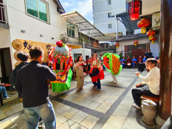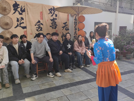 第二站大家来到紫阳民歌传承基地——何家大院,传承人何耀信、何显鹏带领紫阳民歌演唱团队热情地接待了澳门十大信誉网赌大全师生一行。民歌演唱队演唱了多首地道的紫阳民歌,引得大家连连叫好。演唱中穿插表演了划旱船、玩蚌壳、赶毛驴等民俗节目。在互动环节,田川老师演唱了《我和我的祖国》,范义付老师演唱了《西部放歌》,还有多名学生演唱了各地民歌,精彩纷呈,使大家大饱耳福。演唱完毕,民歌演唱团队指导学生参与锣鼓队、划旱船、玩蚌壳、赶毛驴等节目表演,学生对紫阳民歌及民俗表演留下了深刻的印象。